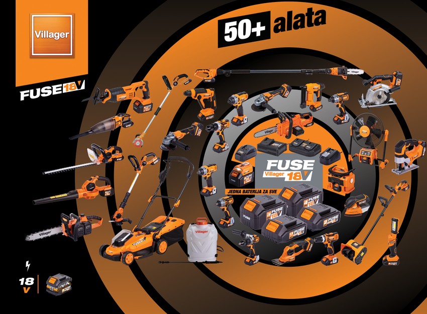 Villager FUSE™ grupa alata, koja predstavlja odličan balans cene, kvaliteta i asortimana. Sa više od 50 alata koje pokreće ista baterija, Villager FUSE™ ostavlja prostora za ogromnu uštedu, jer vam ne treba posebna baterija za svaki komad alata, već je jedna dovoljna za sve.
