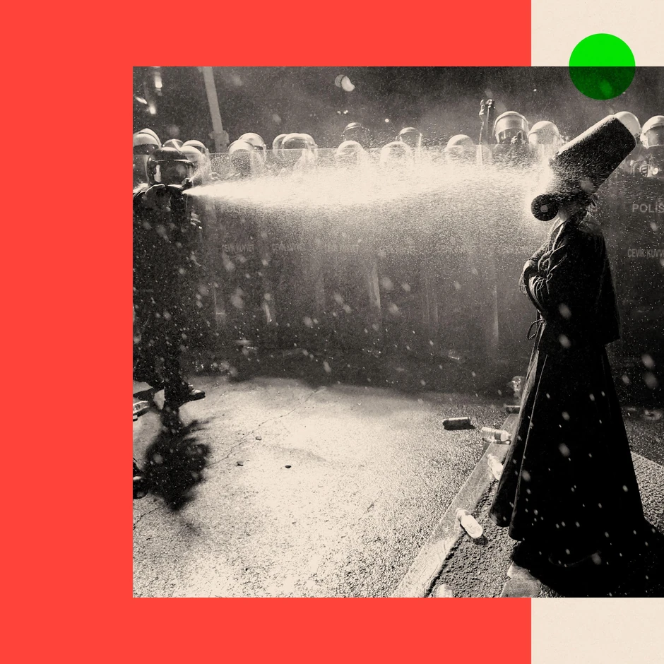 Jedna fotografija je dospela na naslovne strane širom sveta: usamljeni demonstrant obučen kao derviš - u tradicionalnoj nošnji plus gas maska - dok ga policija prska biber sprejom.