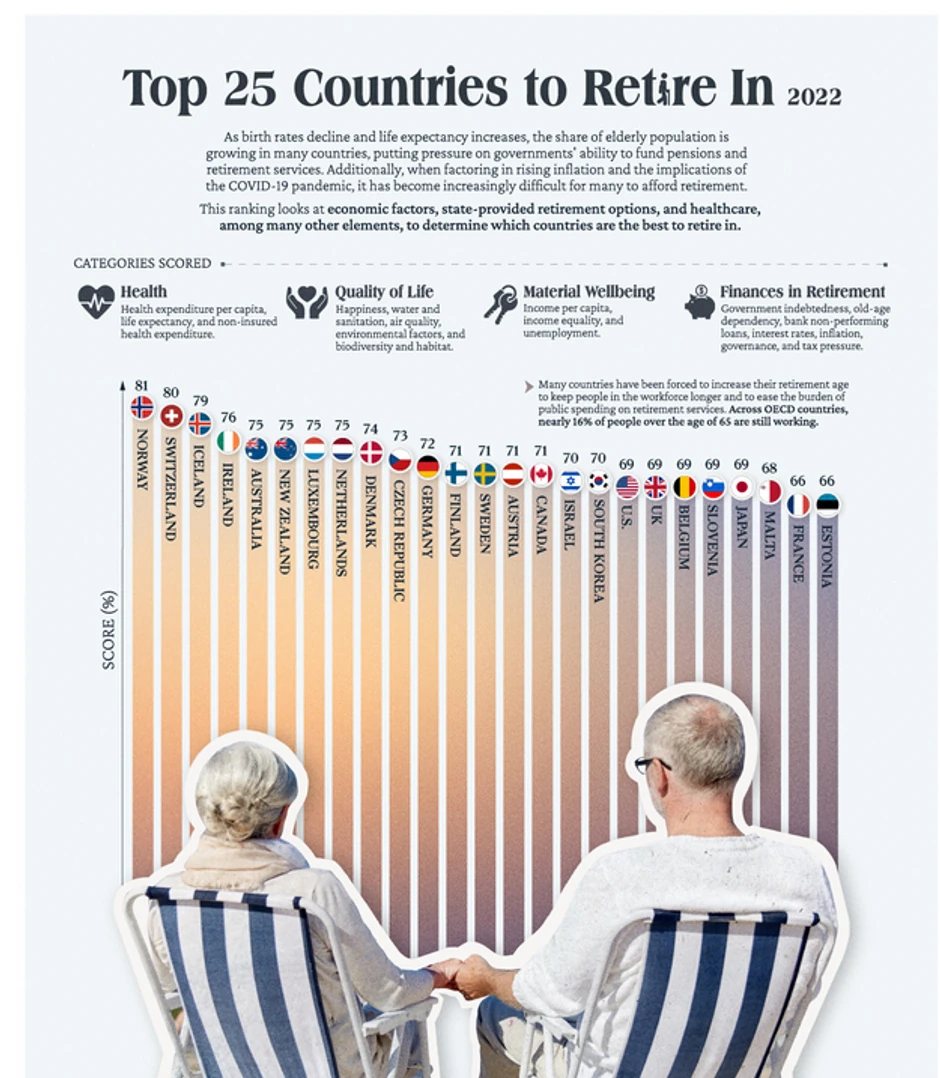 Koje su zemlje najbolje opremljene da podrže svoje starije građane? Ova grafika koristi podatke iz "Natixis Global Retirement Index 2022" kako bi prikazala najbolje zemlje za odlazak u penziju širom sveta, na osnovu nekoliko različitih faktora.