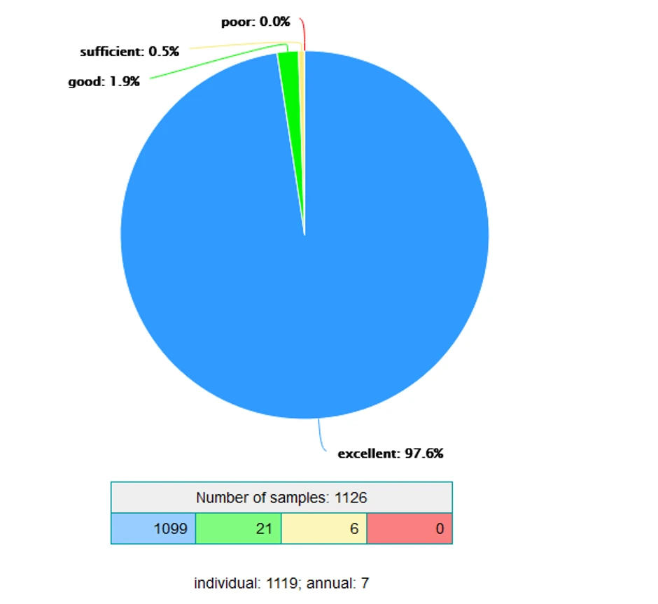 Dostupne ocene kakvoće prikazane su obojanim kružnim simbolima i to plavim (izvrsna), zelenim (dobra), žutim (zadovoljavajuća) i crvenim (nezadovoljavajuća) na Google maps podlogama, kao i brojne popratne informacije (npr. temperature vazduha i mora, slanost, smer vetra). Rezultati se u bazu podataka upisuju odmah nakon završetka analize.
