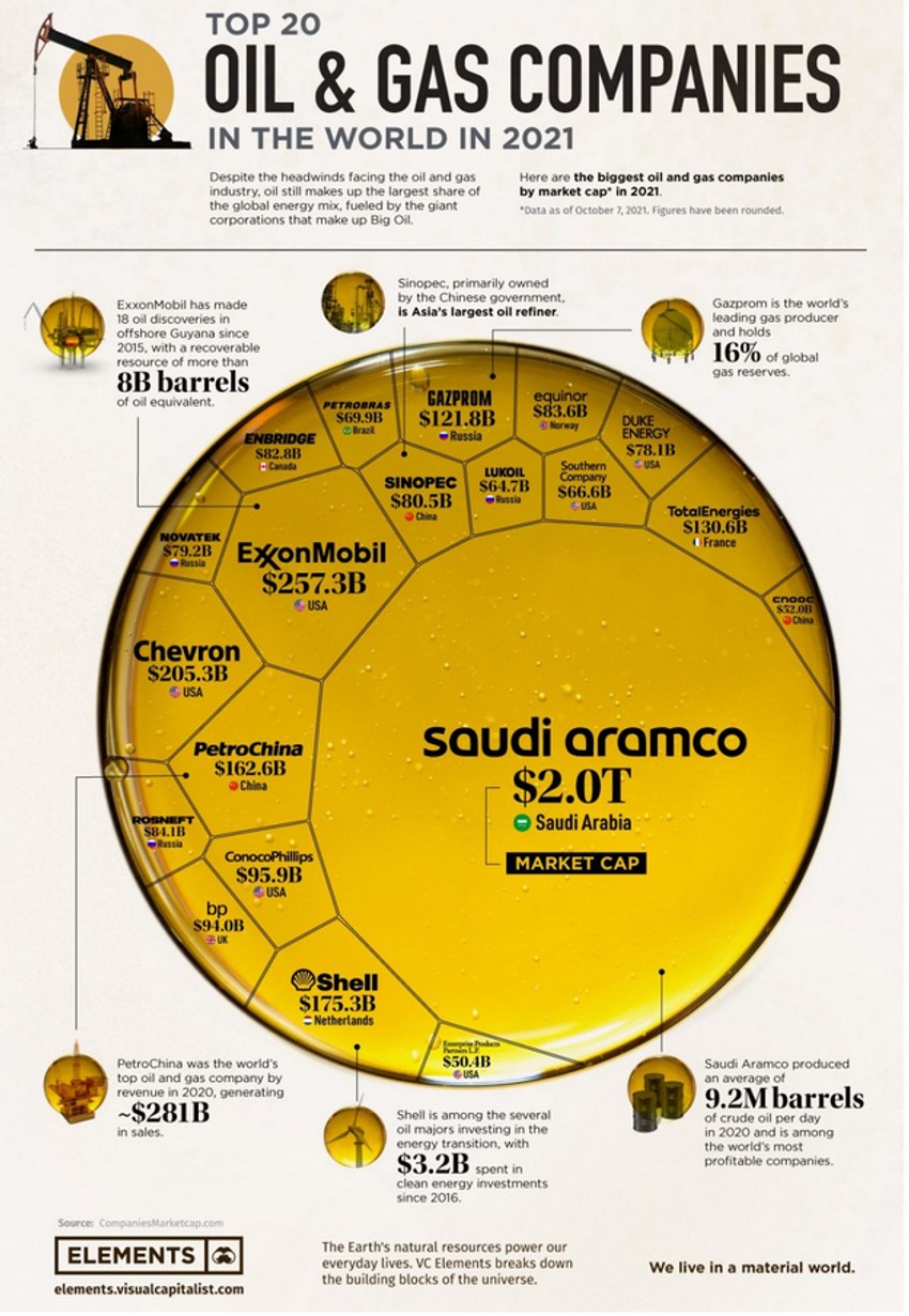 Koristeći podatke sa CompaniesMarketCap.com, infografika rangira 20 najvećih naftnih i gasnih kompanija prema tržišnoj kapitalizaciji od 7. oktobra 2021, piše Visual Capitalist.