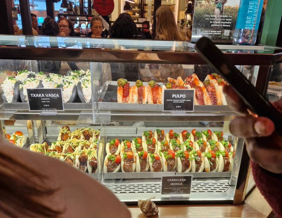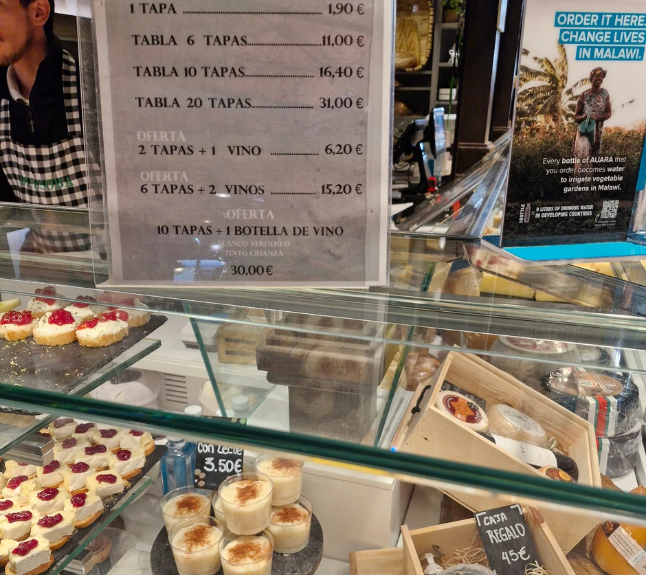 Najpoznatiji španski specijalitet na pijaci su tapasi, koji koštaju od 1.50 do 2 evra po komadu. "Tabla" od 6 tapasa je na jednoj tezgi koštala 11 evra, od 10 komada cena je 16.40 evra, dok bi 31 evro trebalo izdvojiti za veću porciju od 20 komada. Postoji i ponuda - 2 komada plus čaša vina - što je 6.20 evra, a 10 tapasa i flaša vina je 30 evra.