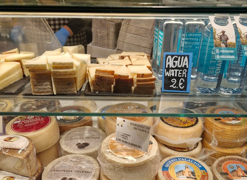 Poklon pakovanje sa tri koluta različitog sira i flašom vina na jednom štandu košta 57 evra. Na primer, videli smo da 100 grama tvrdog madridskog sira košta 3 evra kod jednog izlagača.