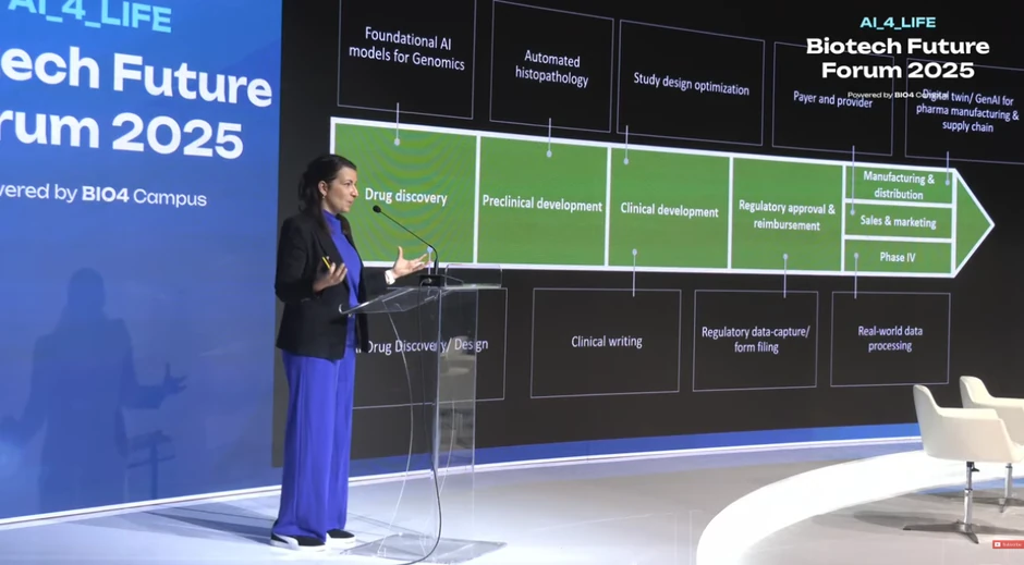 Eva-Marija Hempe je istakla da veštačka inteligencija već pokazuje rezultate u svim fazama farmaceutske industrije. Generativna AI se koristi duž čitavog lanca vrednosti - od osnovnih modela za genomiku i preklinička istraživanja (npr. histopatologija), preko kliničkog razvoja (optimizacija dizajna studija, izbor mesta za klinička ispitivanja), pa sve do interakcije s osiguravačima, pružaocima zdravstvenih usluga i proizvodnje lekova.