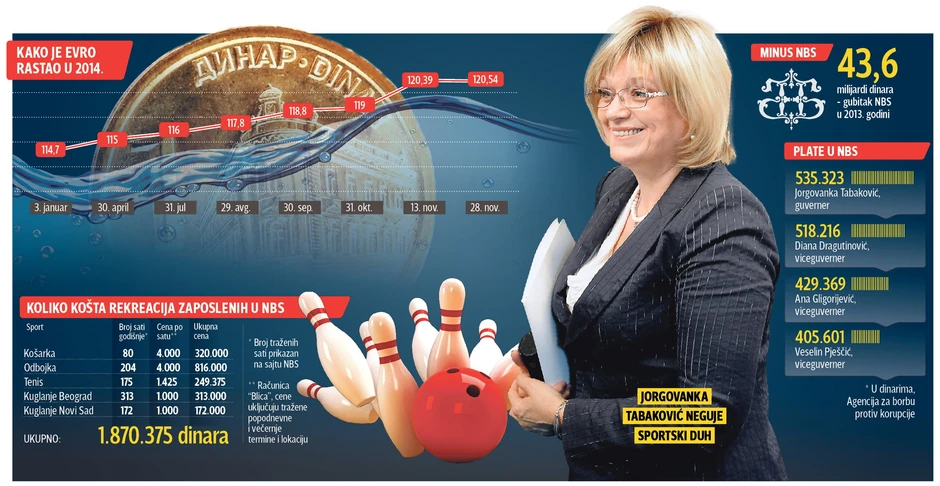 Pritom, Tabakovićeva se ne može pohvaliti rezultatima. Centralna banka završila je prošlu godinu sa minusom od 43,6 milijardi dinara, a guvernerki se “oteo” i kurs - samo u 2014. domaća valuta je u odnosu na evro oslabila pet i po dinara. Na sve to, guvernerka je trenutno jedan od najplaćenijih funkcionera u javnom sektoru, a odbija da Upravi za trezor dostavi podatke o zaradama u NBS.