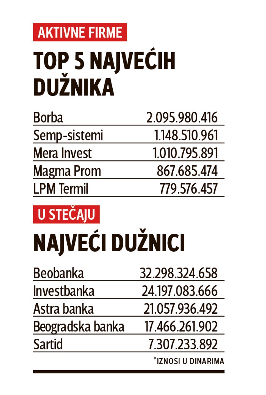 Daleko najveći dužnik na spisku firmi u stečaju je Beobanka. Poreska uprava od nje potražuje čak 32,3 milijarde dinara na ime poreskog duga. Sledi je Investbanka sa 24,2 milijarde duga, zatim Karićeva Astra banka i Beogradska banka sa 17,5 miljardi dinara dugovanja.