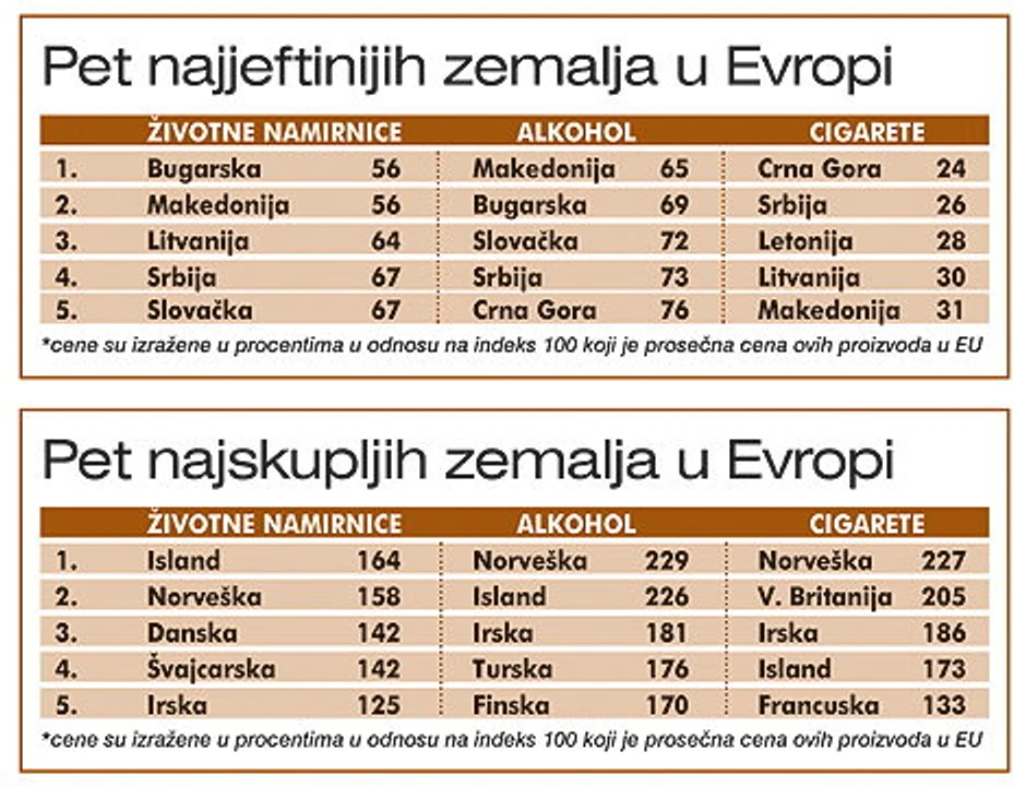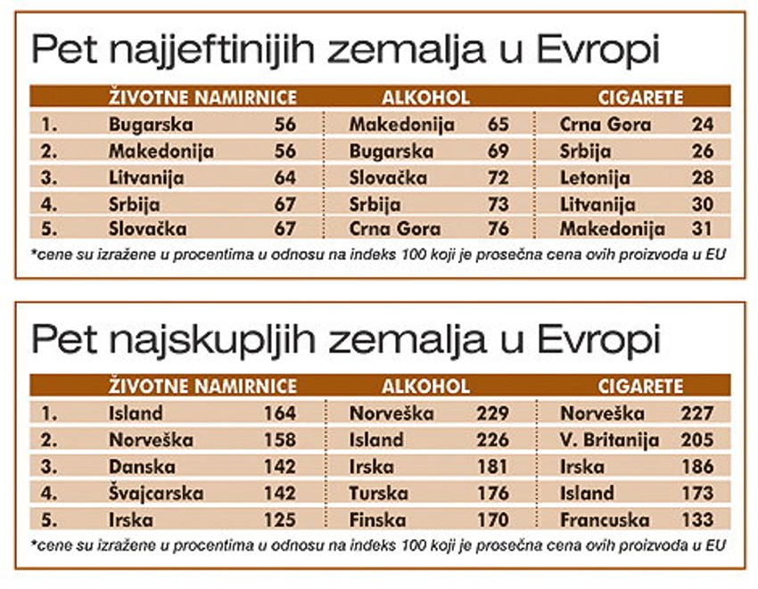Naime, Evropski biro za statistiku je za zemlje EU izračunao prosečne cene životnih namirnica, cigareta i alkoholnih pića i ta cifra je određena kao indeks 100. Sve preko ili ispod te brojke govori koliko su pomenuti proizvodi skuplji, odnosno jeftiniji u svim zemljama Evrope.
