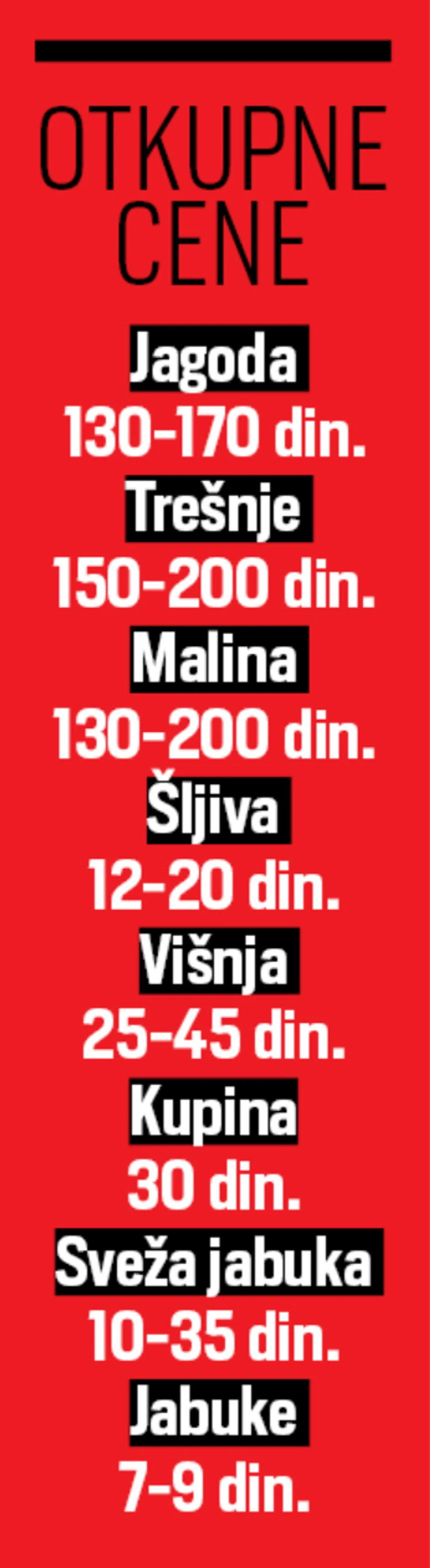 Međutim, kada su u pitanju strateške voćke, koje se gaje na većim površinama i od kojih proizvođači očekuju veći profit, umesto njega imali su glavobolju. Naime, šljiva je i pored odličnog kvaliteta ploda imala mizernu cenu od 12 do 20 dinara, višnja od 25 do 45, dok su trešene jabuke kupovane za tek od 7 do 9 dinara, a sveže maksimalno za 35 dinara kilogram. Konačno, posebna tužna priča je i prošle godine važila za malinu, nekadašnje srpsko crveno zlato, ali i za kupinu.