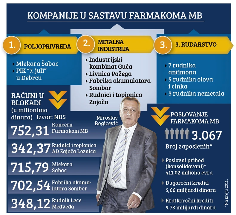 Na jučerašnji dan, u blokadi su bili računi rudnika Zajače i Lece, Mlekare Šabac i Fabrika akumulatora Sombor, kao i račun samog koncerna „Farmakom MB“, a ukupan iznos blokade je 2,86 milijardi dinara. Zbog neisplaćenih zarada, štrajkovali su radnici u Fabrici akumulatora Sombor i Industrijskom kombinatu Guča, a još uvek je aktuelan štrajk u Rudniku i Topionici „Zajača“, gde pored plata, zaposleni traže i overu zdravstvenih knjižica. Osim toga, „Farmakom MB“ je dužan i državi oko 195 miliona dinara na ime naknade za korišćenje mineralnih sirovina.
