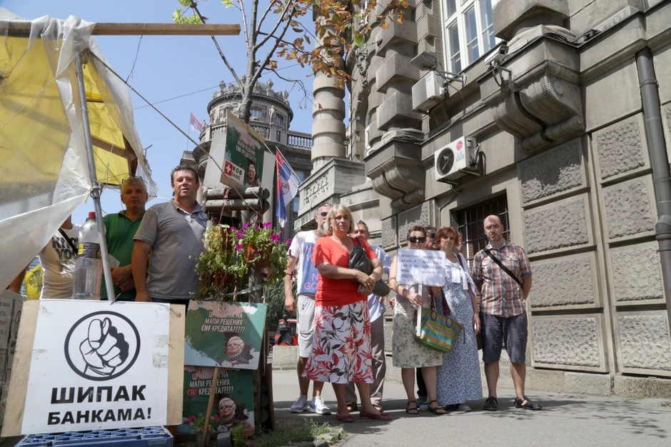 Ovako priča jedan od dužnika kredita u švajcarcima, jedan od onih koji su se juče, 93. dan zaredom, okupili ispred Vlade Srbije u nadi da će neko da im se obrati. Odluka britanskih glasača da ova zemlja napusti Evropsku uniju izazvala je novi skok švajcarskog franka. Nekima je, samo za dan, ukupan dug uvećan za 2.000 evra zbog Bregzita... Ispred zgrade Vlade i dalje leprša na vrućem vetru plastična lutka, koja je rešila da se obesi. Iz Vlade niko ne izlazi.