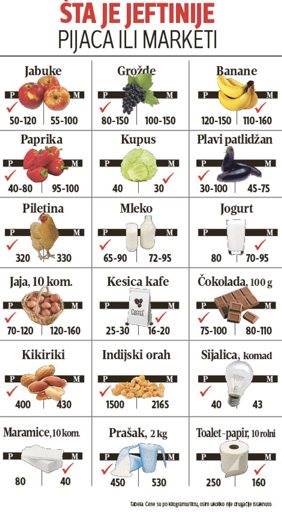 Grožđe, jaja i sijalice povoljniji su na pijaci, dok se kafa, jogurt i banane po nižim cenama mogu naći na akcijama u marketima.