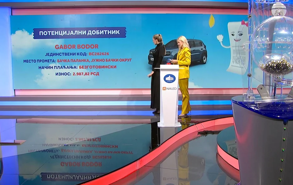 U trećem kolu novog ciklusa nagradne igra "Uzmi račun i pobedi" večeras su izvučena dva dobitnika električnog automobila "fijat panda la prima" Bojana Vujsić i Gabor Bodor i dobitnik dupleksa u naselju Zemunske kapije Dane Žigić.