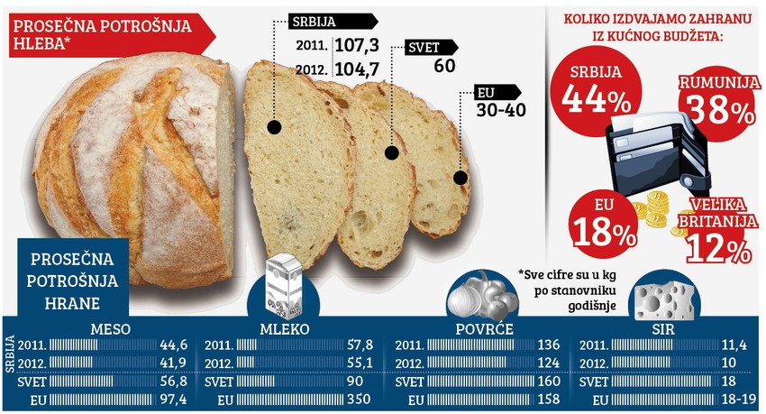 U Srbiji se godišnje pojede 105 kilograma hleba po stanovniku, što je najveća potrošnja ove namirnice u Evropi. Pored toga što se jede hrana koja ima manju hranljivu vrednost, u Srbiji generalno opada potrošnja hrane.