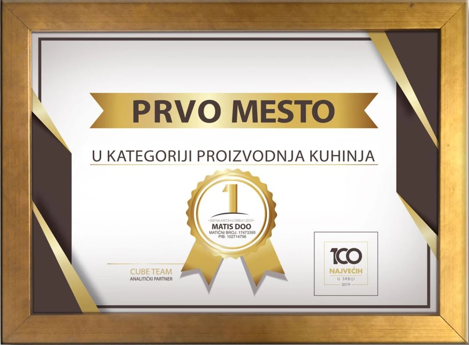U okviru projekta “100 najvecih u Srbiji”, kompanija “Matis” iz Ivanjice se izdvojila od drugih osvojivši još jednu prestižnu nagradu, kao dokaz kvaliteta njihovih proizvoda. “Matis” je zauzeo prvo mesto u kategoriji “proizvodnja kuhinja” za 2019. godinu.