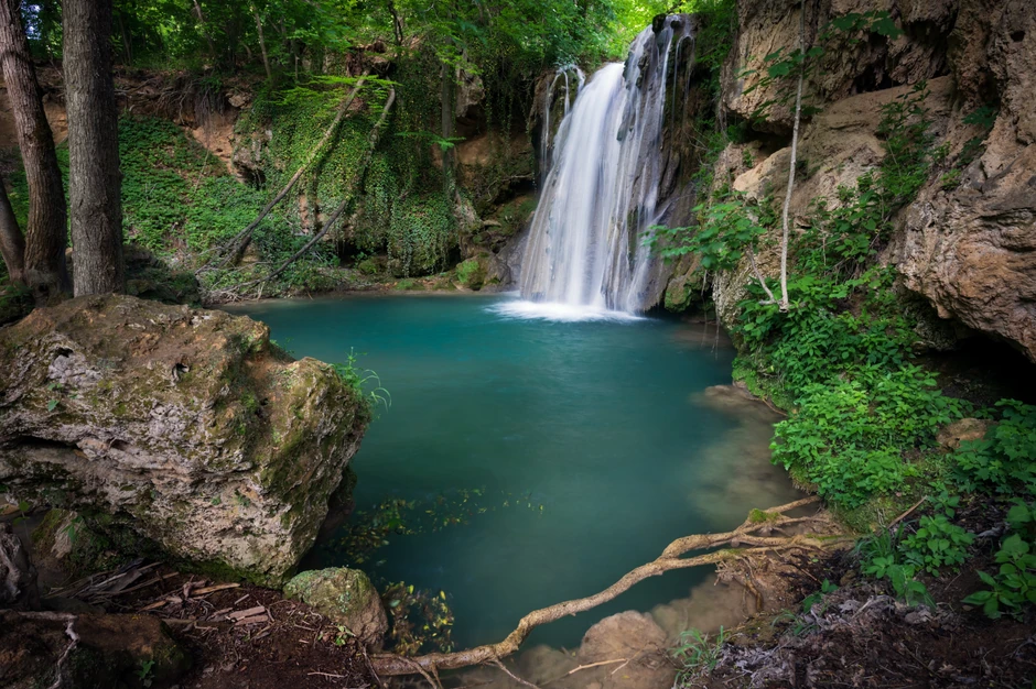 Vodopad visok oko sedam metara stvara prepoznatljivo jezero zelenkasto-tirkizne boje, okruženo šumom i sedrenim formacijama