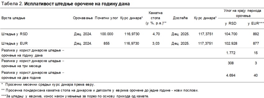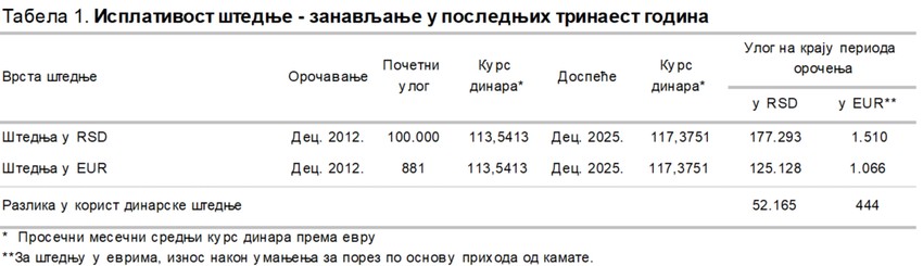 Štednja u domaćoj valuti oročena na godinu dana, koja nije zanavljana, bila je isplativija u gotovo 99% posmatranih godišnjih potperioda (143 od ukupno 145) od takve štednje u evrima u prethodnih 13 godina.