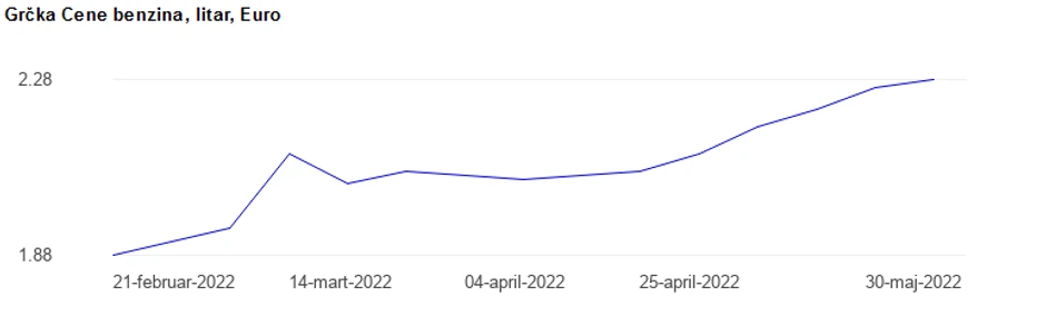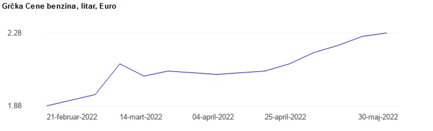 Prosečna cena benzina u Grčkoj u periodu od februara do maja iznosila je 2,08 evra. Prema zvaničnim podacima tokom navedenog perioda minimalna cena iznosila je 1.88 evra 21. februara 2022. godine, dok je maksimalna cena zabeležena 30. maja i iznosila je 2.28 evra. U ovom periodu prosečna cena benzina u svetu iznosila je 1.81 evra.