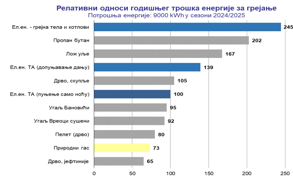 Troškovi grejanja korišćenjem prirodnog gasa ove grejne sezone su isti kao i prethodne, iznose 59,5 hiljada dinara što je za samo 6,5 hiljada dinara skuplje od najpovoljnijeg grejanja korišćenjem drveta.