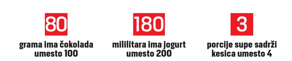 Čokolade nisu jedini primer, već su se i kod drugih proizvoda pakovanja smanjila, pa tako, na primer, supe koje su nekada pakovane za četiri tanjira, sada su za tri, jogurt nije od 200 mililitara, već 180, deterdžent koji je nekad bio u pakovanju od litru, smanjen je na 700 ili 800 mililitra, ili sa 500 na 400...