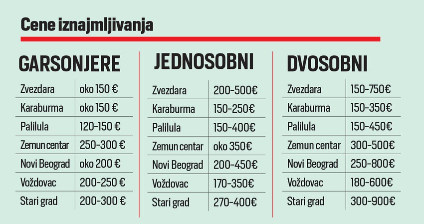 U praksi se najlakše izdaju garsonjere i mali stanovi do 40 kvadrata, kao i oni čija je cena od 150 do 200 evra mesečno.