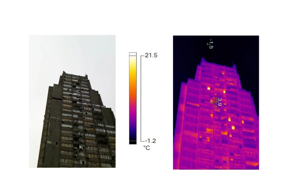 Kao i u prethodnom slučaju i ovde se vrlo lako vidi kako neizolovani betonski zidovi konstrukcije i stara stolarija gube toplotu i povećavaju račune stanovnicima ove zgrade.