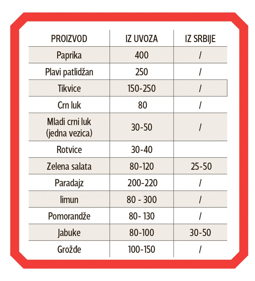 Pijace su pune su raznovrsnog voća i povrća, ali cene na pojedinim više su nekoliko puta u odnosu na sezonu. Tako kilogram paprike dostiže čak 400 dinara, a kilogram mladih krompirića čak 450.