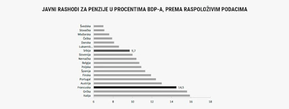 U Francuskoj, u kojoj je u poslednje vreme veliki otpor građana zbog povećanja starosne granice za odlazak u penziju sa 62 na 64 godine, izdvajanja su oko 14,5 odsto. I Francuska se sa tolikim izdvajanjima našla na trećem mestu među zemljama OECD-a.