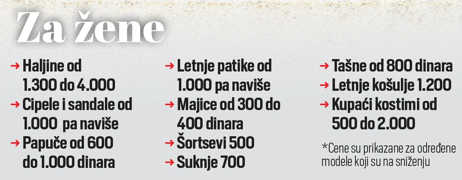 Septembar je mesec kada su artikli poput majica, šortseva, sukanja, haljina, ali i obuće - sandala, cipela i patika na sniženju od 50 do 80 odsto. Majice se mogu pazariti po ceni od 400 dinara, sandale za 1.500, letnje patike za 1.000, šortsevi za 500, suknje za 700...