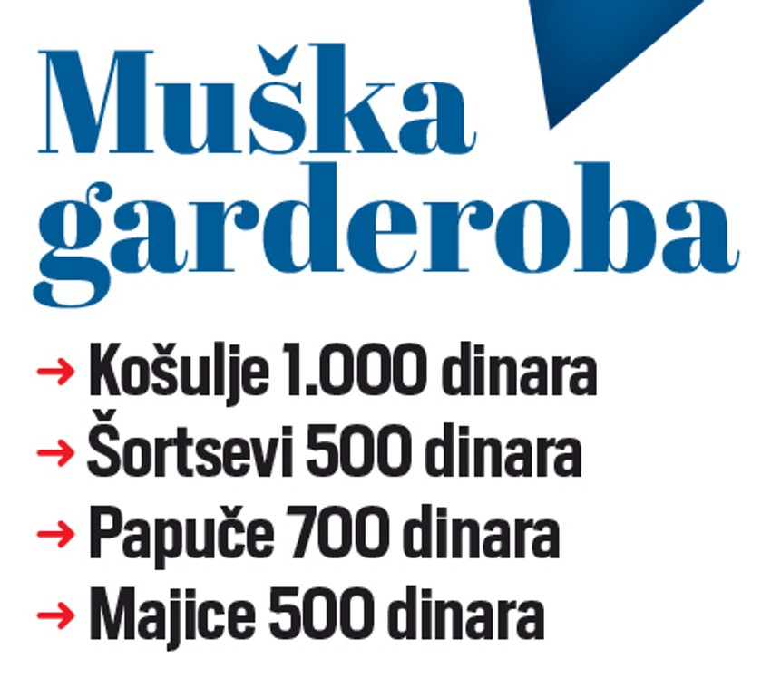 Garderoba za muškarce je takođe na sniženju, košulje se mogu kupiti za 1.000 dinara pa naviše, šortsevi za 500 dinara, papuče za 700 dinara, majice za 500 dinara.