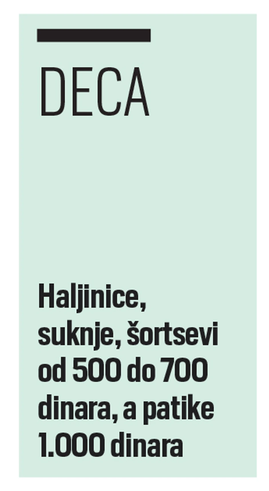I dečja garederoba se može pazariti po znatno nižoj ceni, haljinice, suknjice, letnji kompleti se mogu pazariti po ceni od 500 do 700 dinara i naviše. Patike za decu u zavisnosti od kvaliteta mogu se pazariti i za 1.000 dinara, iako su više letnje, one se mogu poneti i tokom suvih jesenjih dana.
