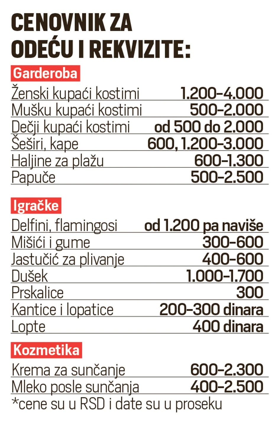 Haljine za plažu koštaju oko 600 dinara do 1.300, ali ima i skupljih varijanti, cena dečje garderoba slična je kao i za odrasle, s tim što su brendirane stvari skuplje. Šortsevi za kupanje koštaju od nekih 500 dinara do 2.000 dinara, kupaći kostim za dečaka košta između 400 i 600 dinara. Ženske papuče za plažu kreću se u proseku od 500 do 2.500 dinara, za muškarce od nekih 500 dinara do 2.000 dinara, dečje koštaju u proseku od 400 do 1.800 dinara. Delfini, flamingosi za plivanje u proseku koštaju od 1.200 dinara pa naviše, mišići za plivanje od 300 do 600 dinara. Veliki i neophodan izdatak predstavlja kupovina kozmetike za sunčanje, cene naravno variraju od kvaliteta proizvoda.
