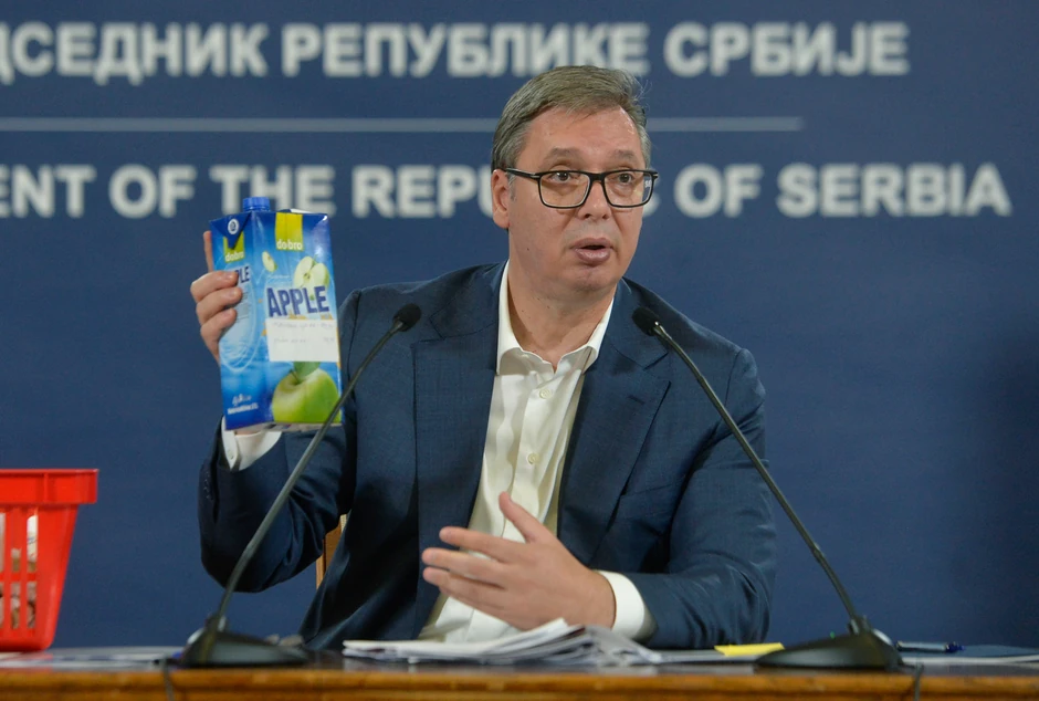 "Redovna cena parizera je 399 dinara, a biće 259 dinara, jogurt je bio 164 dinara, a biće 134. Ovo je naš način da pokažemo koliko brinemo za ljude. Cena soka od jabuke umesto 120 dinara biće 80, krompir će umesto 99 koštati 60 dinara, imaćete domaći začin od 70 za 50 dinara, šampon za bebe od 107 dinara 69,9 dinara, što je važno za roditelje, a kafa će umesto 130,99 dinara biti 89,99 dinara", najavio je Vučić.