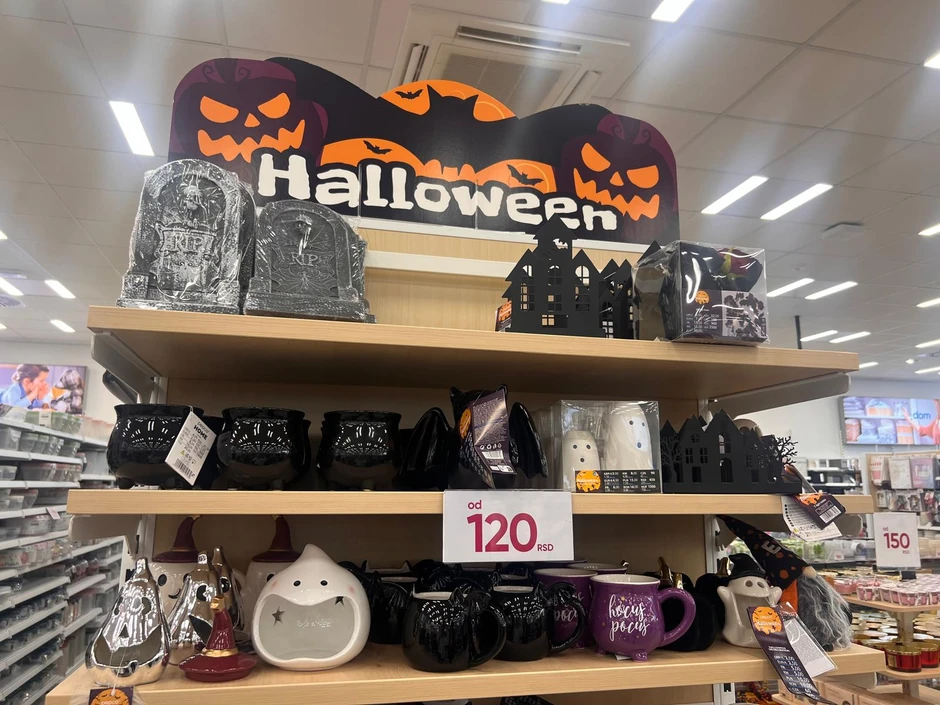 Šolje, čaše, kalupe za kolače, možemo pronaći u različitim oblicima, poput veštičijeg kotla, bundeva, duhova. Cene ovih ukrasa se kreću od 120 dinara, pa do 800 dinara.