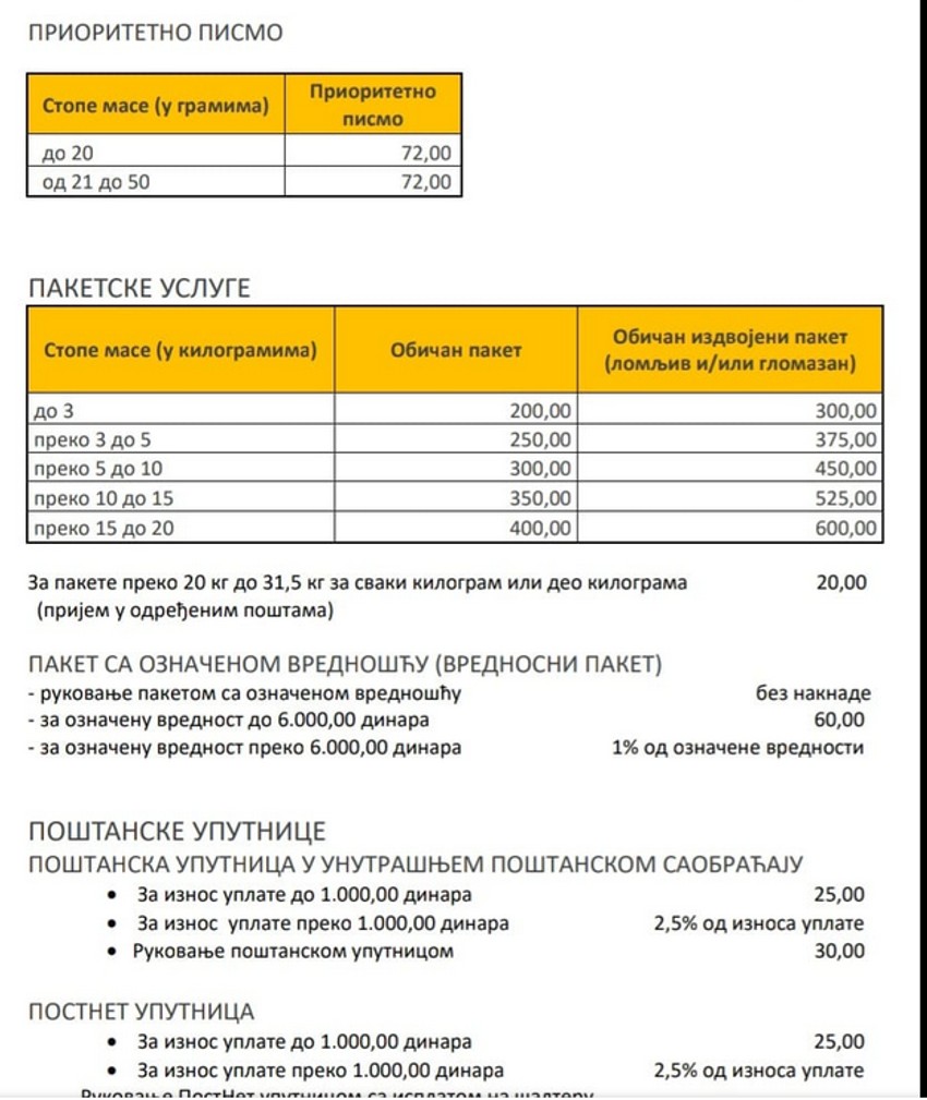 Prioritetno pismo do 20 grama, kao i ono u kategoriji od 21 do 50 grama koštaće 72 dinara.