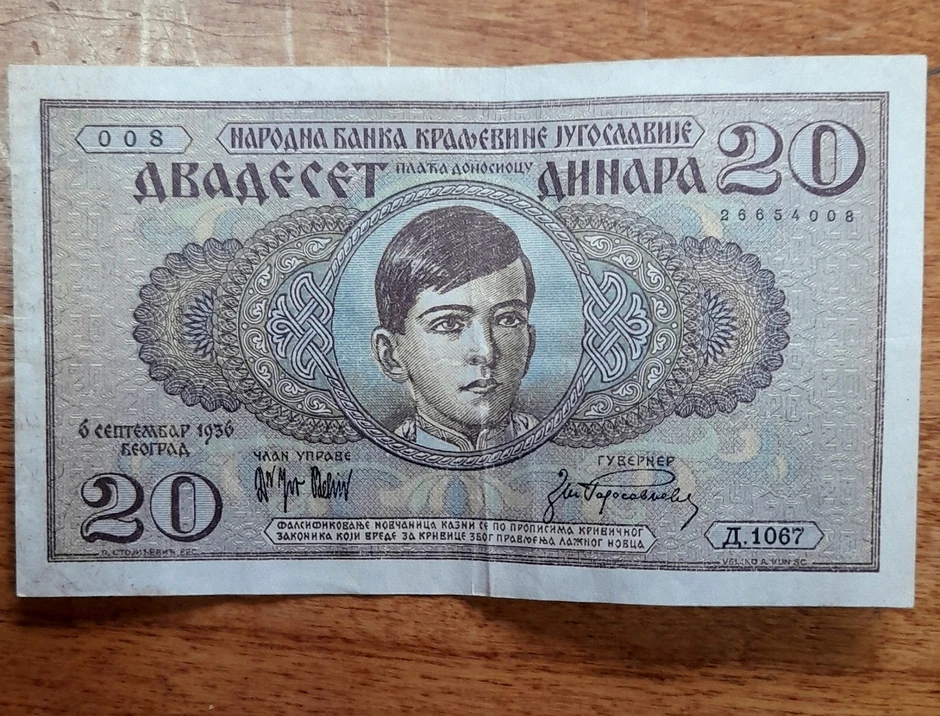 Posle Drugog svetskog rata Demokratska Federativna Jugoslavija izdala je prve posleratne novčanice. Štampane su u početku u Sovjetskom Savezu, a osnovni motiv bila je bista partizana s puškom o levom ramenu. Teme novčanica iz prvog izdanja, koje veličaju tekovine rata, ubrzo su zamenili motivi koji personifikuju ideju razvoja novog socijalističkog društva.