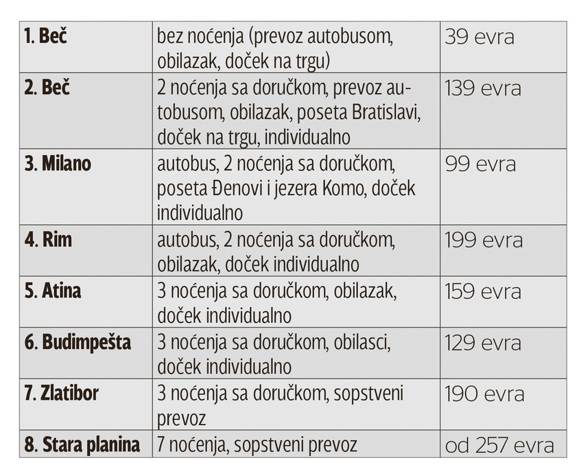 U ponudi je Milano sa dva noćenja, a cena aranžmana je od 99 evra. Bolonja tri noći je 140 evra po osobi, a Rim je skuplji, od 170 do 200 evra. U pitanju je prevoz autobusom, ali istovremeno se rade i aranžmani sa avionskim prevozom.