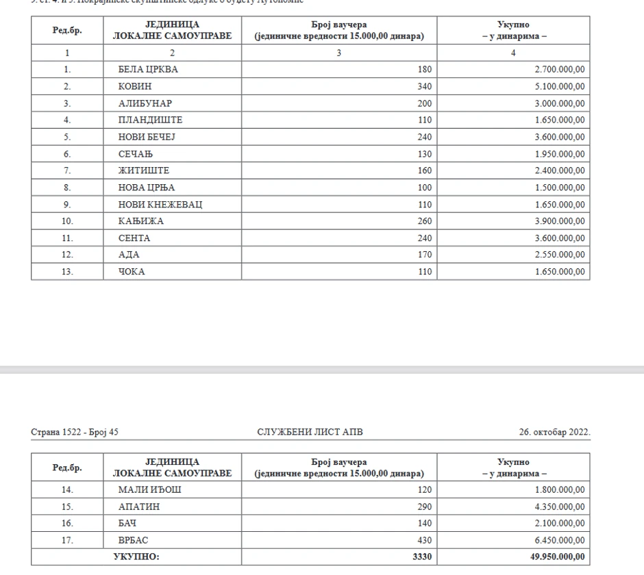 Za vaučere za nabavku energenata u iznosu od 15.000 dinara, koje će dobiti najugroženiji stanovnici 17 opština u AP Vojvodini, ukupno je izdvojeno 49,9 miliona dinara.