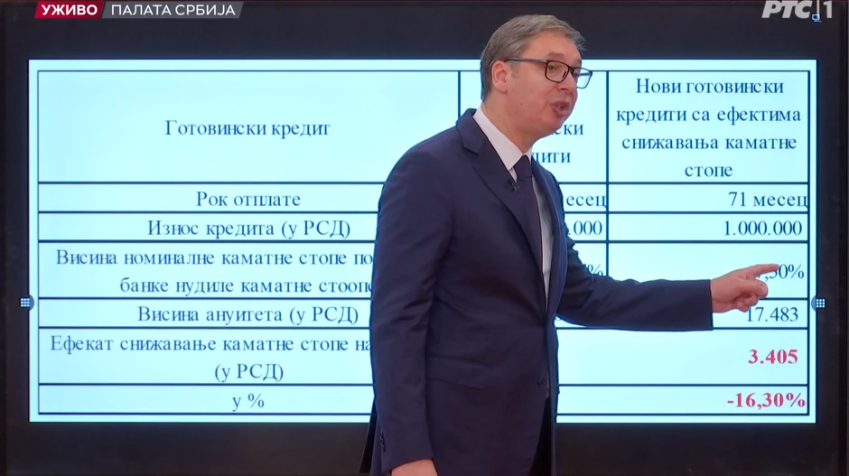 Najavljeno je će smanjenje da se odnosi na zaposlene sa primanjima do 100.000 dinara, gde se nalazi 64,3 odsto radnika, kao i na penzionere sa primanjima do 100.000, gde je 92 odsto penzionera, kao i da će se ići na to da se smanjenje kamatnih stopa odnosi na sve penzionere, to jest i na preostalih osam odsto.
