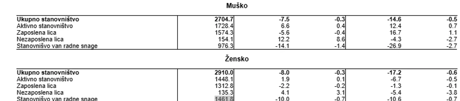 U odnosu na isti kvartal prethodne godine, broj zaposlenih lica povećan je za 15.400, dok je broj nezaposlenih lica smanjen za 9.700, kao i broj stanovnika van radne snage za 37 600.