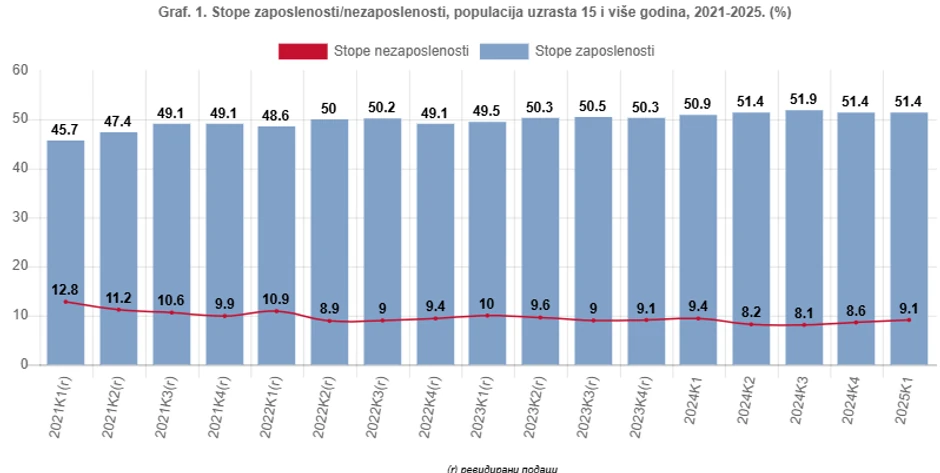 U prvom kvartalu 2025. godine stopa zaposlenosti porasla je na 51,4%, dok je stopa nezaposlenosti smanjena na 9,1%