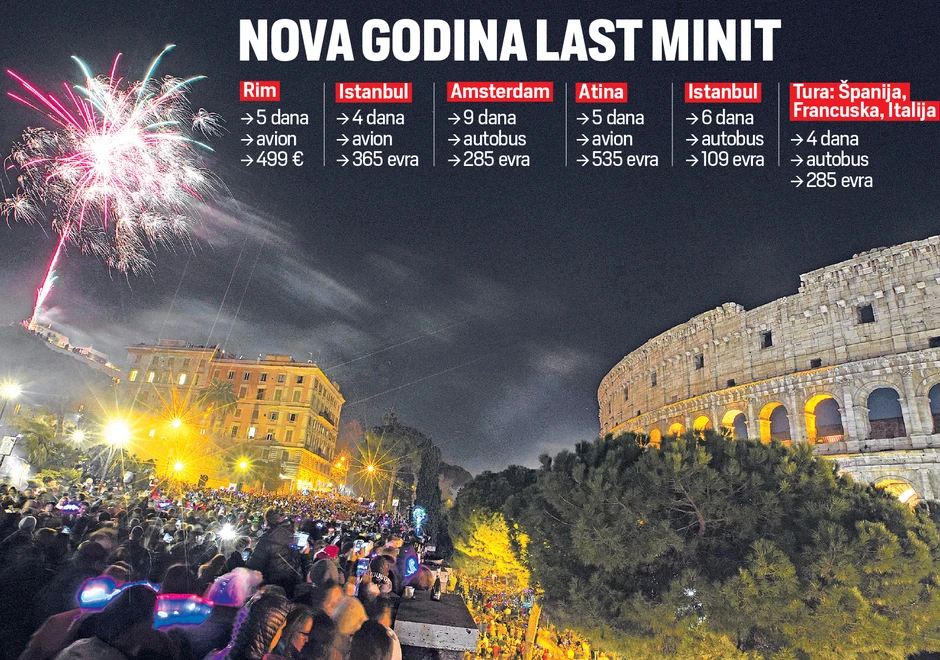 Tako je petodnevno putovanje uoči Nove godine na Azurnu obalu autobusom, od 29. decembra do 2. januara, sniženo sa 179 evra na 139 evra. Putnici obilaze San Remo, Kan, Nicu, Monako, Monte Karlo i dočekuju Novu godinu, a zatim odlaze u Đenovu, odakle se vraćaju u Srbiju. U istom terminu Atina je snižena sa 179 na 129 evra. Prevoz je autobusom i predviđena su dva noćenja sa doručkom. Milano od 30. decembra do 3. januara je 129 evra. Za polazak iz Niša doplata je 20 evra, a u cenu je uključen smeštaj i dve noći sa doručkom.