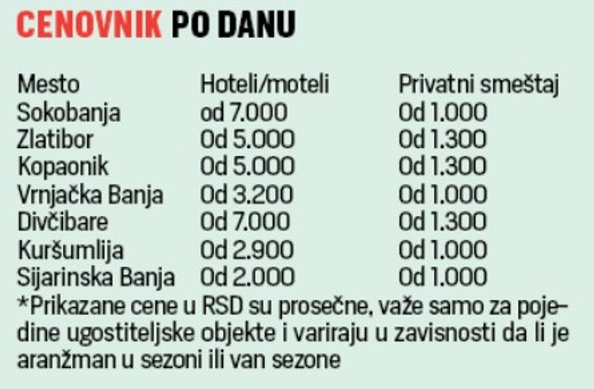 Prema važećem cenovniku, najjeftinije je u banjama, mada se i na planinama može pronaći povoljan smeštaj. Privatni smeštaj je svakako najjeftinija opcija i kreće se između 1.000 i 2.000 dinara po danu, dok je u hotelima cena skuplja i prilagođena je sezonskom i vansezonskom odmoru. U julu i avgustu su cene najskuplje.