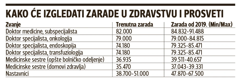 Kako saznajemo, ideja radne verzije sistema platnih razreda je da novi koeficijenti donesu najveće povećanje zarada zaposlenima čija su primanja potcenjena. Tako će medicinske sestre u domovima zdravlja, koje trenutno zarađuju oko 35.000 dinara, moći da očekuju platu između 37.043 i 39.331 dinara. Njihove koleginice u bolnicama na opštim odeljenjima sa platom od 36.935 dinara dobijaće od 39.511 do 40.657 dinara, dok će plate lekara rasti i za 11.000 dinara, pa će plata doktora subspecijaliste biti veća od 91.000 dinara (vidi tabelu).