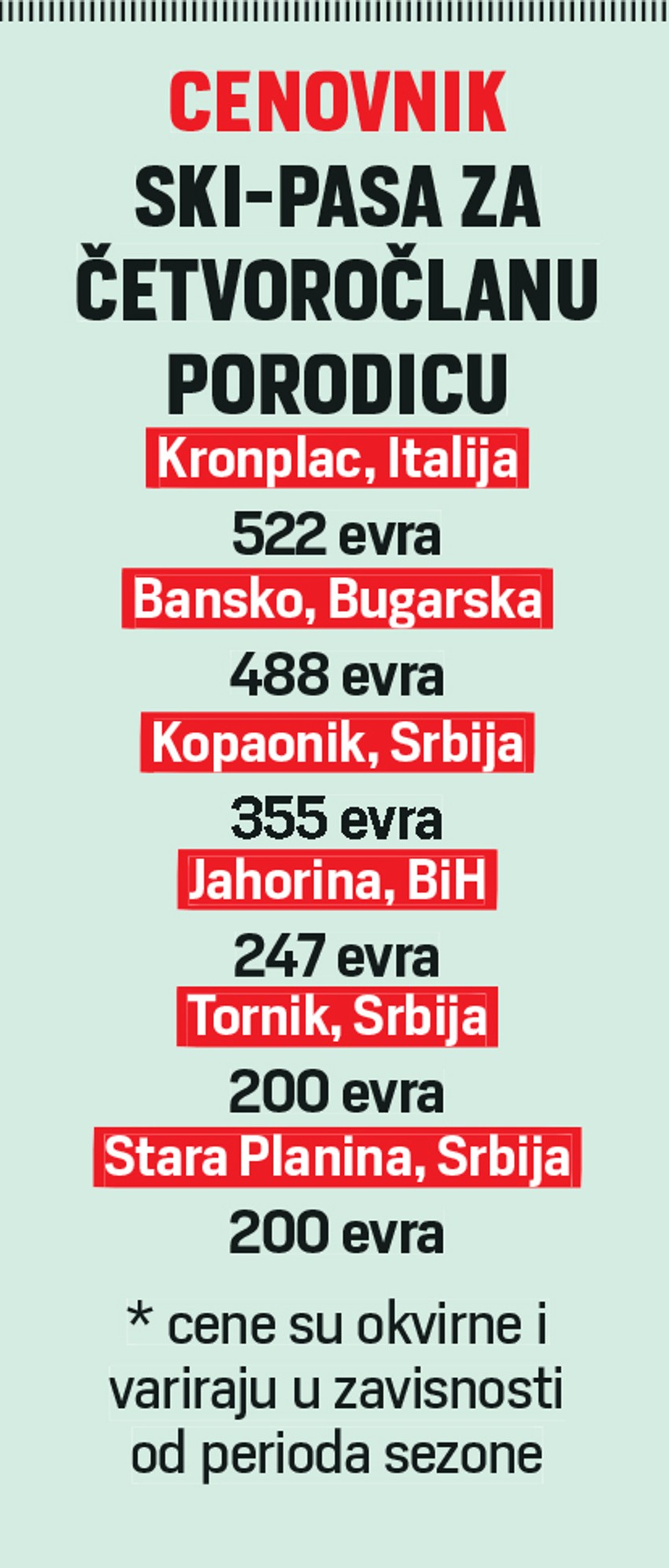 Kranjska gora je već na početku ove sezone privukla veliki broj skijaša iz Srbije, a prema cenovnicima polupansion za jednu osobu na bazi sedam noćenja u hotelu sa tri zvezdice je 372 evra, dok su luksuznije sobe sa četiri zvezdice 428, 510 ili 580 evra. Gosti imaju mogućnost neograničenih ulazaka u vodeni park i bazene pojedinih hotela.