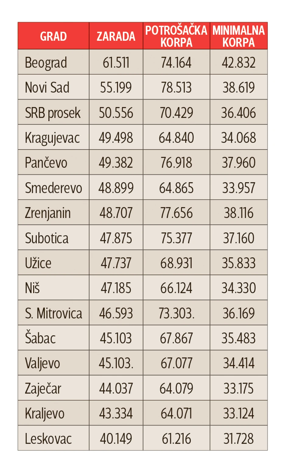 Sa većom platom, rastu i troškovi, te prema statističkim podacima minimalna potrošačka korpa u Beogradu košta 42.832 dinara, a u Novom Sadu 38.619 dinara.