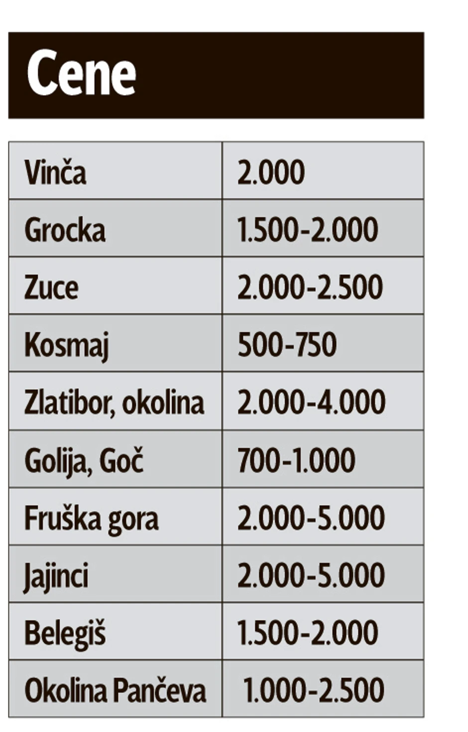 - Na Kosmaju, recimo, na kilometar od samog vrha ove planine, koja se nalazi na 60 kilometara od centra Beograda, ar placa košta od 400 do 750 evra. Reč je o građevinskim placevima, uz glavni put, čija je površina oko 10 ari, sa strujom, ali bez vode. Ovi placevi udaljeni su od Mladenovca oko 14 kilometara i ubrajaju se u grupu vikend placeva. U istom delu, cena kuća sa kompletnom infrastrukturom je od 18.000 do 60.000 evra - kaže za „Blic“ Tanja Jovančević iz agencije koja u svojoj ponudi pretežno ima Kosmaj.
