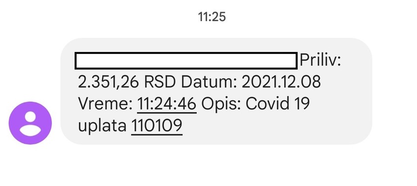Za razliku od ranije, kada se u sms poruci nalazilo nekoliko informacija o samoj uplati državne pomoći, ova sada daleko je sažetija. Nakon uplaćenog iznosa od 2.351,26 dinara u opisu samo pišeda se radi o "Covid 19 uplati". Ranije je uz ove podatke išla i informacija da novac uplaćuje Ministarstvo finansija odnsno Uprava za trezor i da se radi o uplati novčane pomoći punoletnim državljanima.