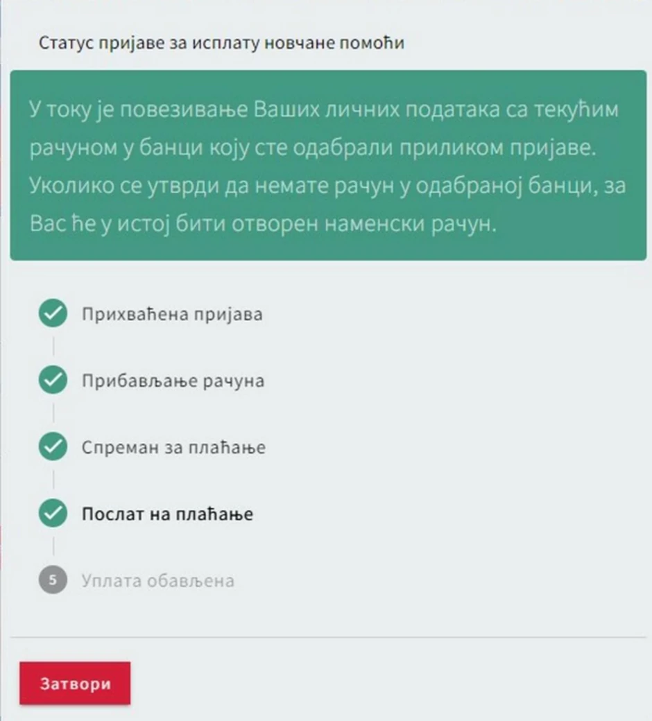 Provo je novac isplaćen svim penzionerima, korisnicima socijalne pomoći i građanima koji izdržavaju zatvorsku kaznu. U sredu je novac uplaćen na račune 2,3 miliona građana, a juče i na račune preostalih 1,75 miliona prijavljenih građana.