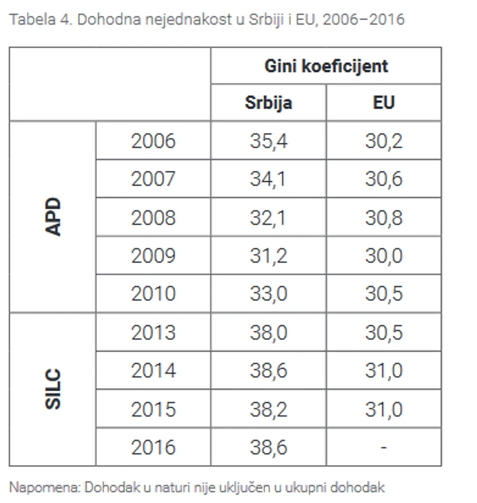 Od 2013. do 2016. godine džini se popeo sa 38 na 38,6 poena, što je značajan negativni rast, a u periodu od deset godina od 2006. do 2016. porastao je za čak 3,2 poena. Ako uporedimo stanje u istom periodu u Evropskoj uniji, džini koeficijent se popeo za svega 0,8 poena.