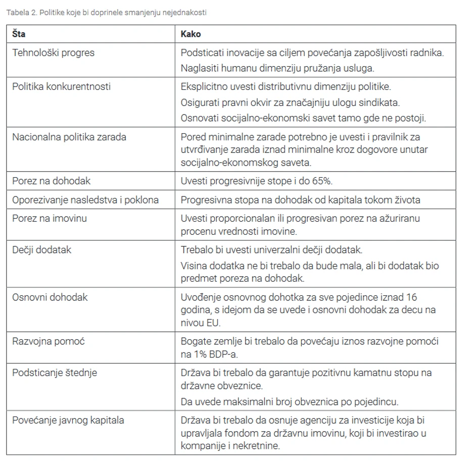U tabeli su prikazane mere koje bi pozitivno uticale na smanjenje nejednakosti dohotka u našoj zemlji sa konkretnim predlozima koje nudi pomenuta grupa autora.